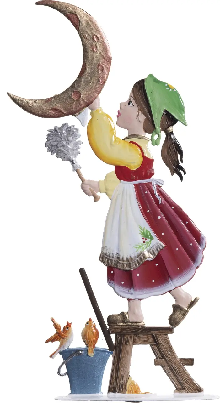 14 x 6 cmLassen Sie sich von dieser entzückenden Figur verzaubern, die die Sterne zum Leuchten bringt! Mit ihrer bezaubernden Darstellung einer jungen Helferin, die hoch hinaus möchte, um den Himmel zu polieren, weckt sie Kindheitserinnerungen und Frühjahrsgefühle. Stehend auf einer rustikalen Holzleiter, neben ihr zwei neugierige Vögel, bringt diese liebevoll gestaltete Skulptur Freude in jedes Heim oder Büro. Ein einzigartiges Geschenk für kleine Träumer und diejenigen, die sich nach einer Prise Magie sehnen. Ideal geeignet, um jedem Raum einen Hauch von Frühling und Staunen zu verleihen.