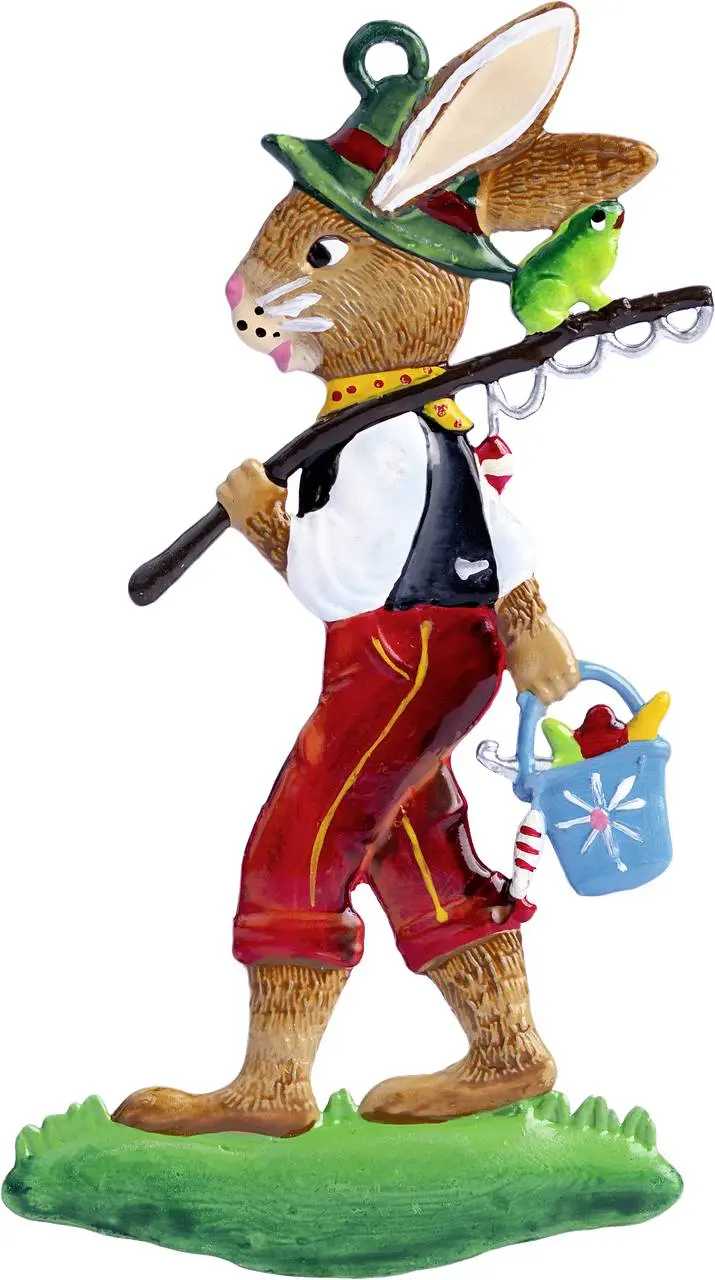 Ein fröhlicher Angler in traditioneller Tracht schreitet mit Angelrute und einem gefüllten Eimer voller Überraschungen ins neue Jahr, begleitet von einem grünen Gefährten.
